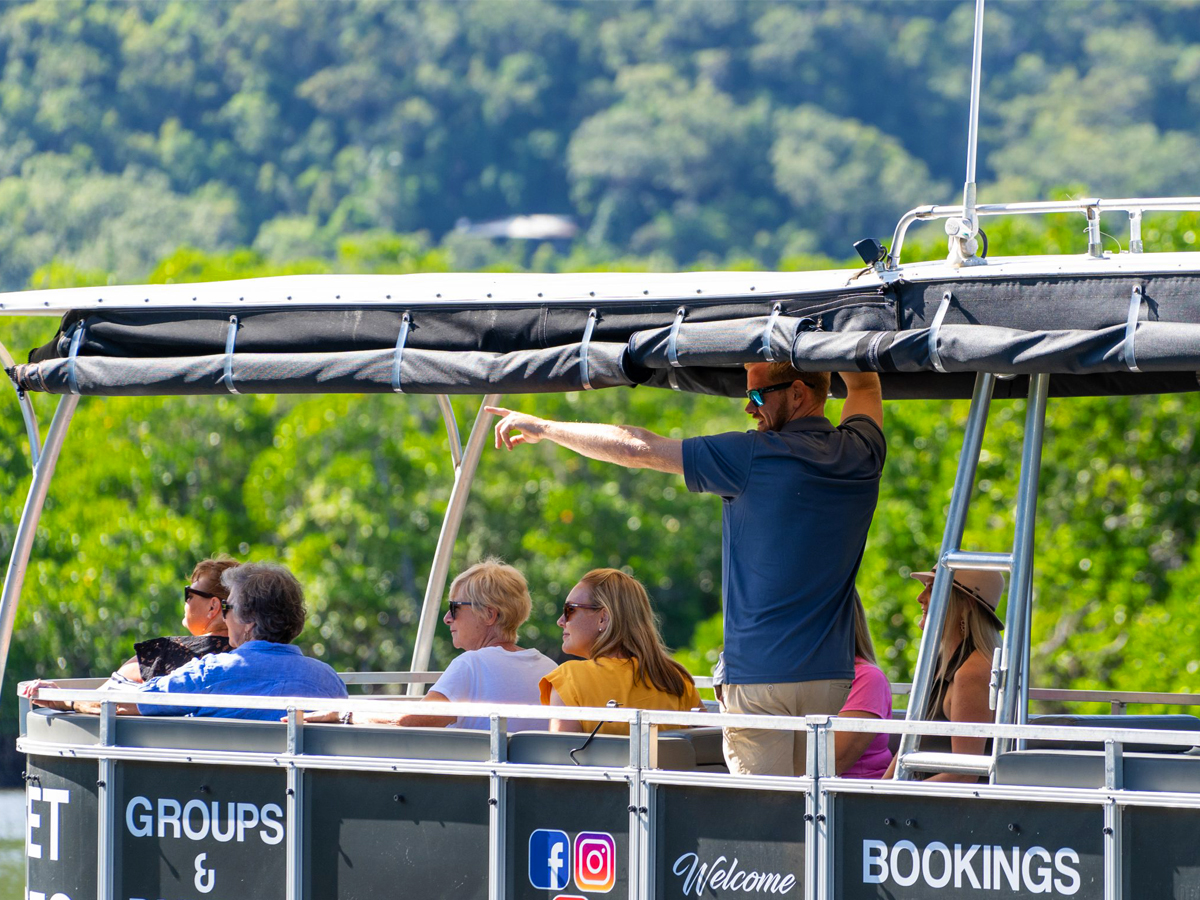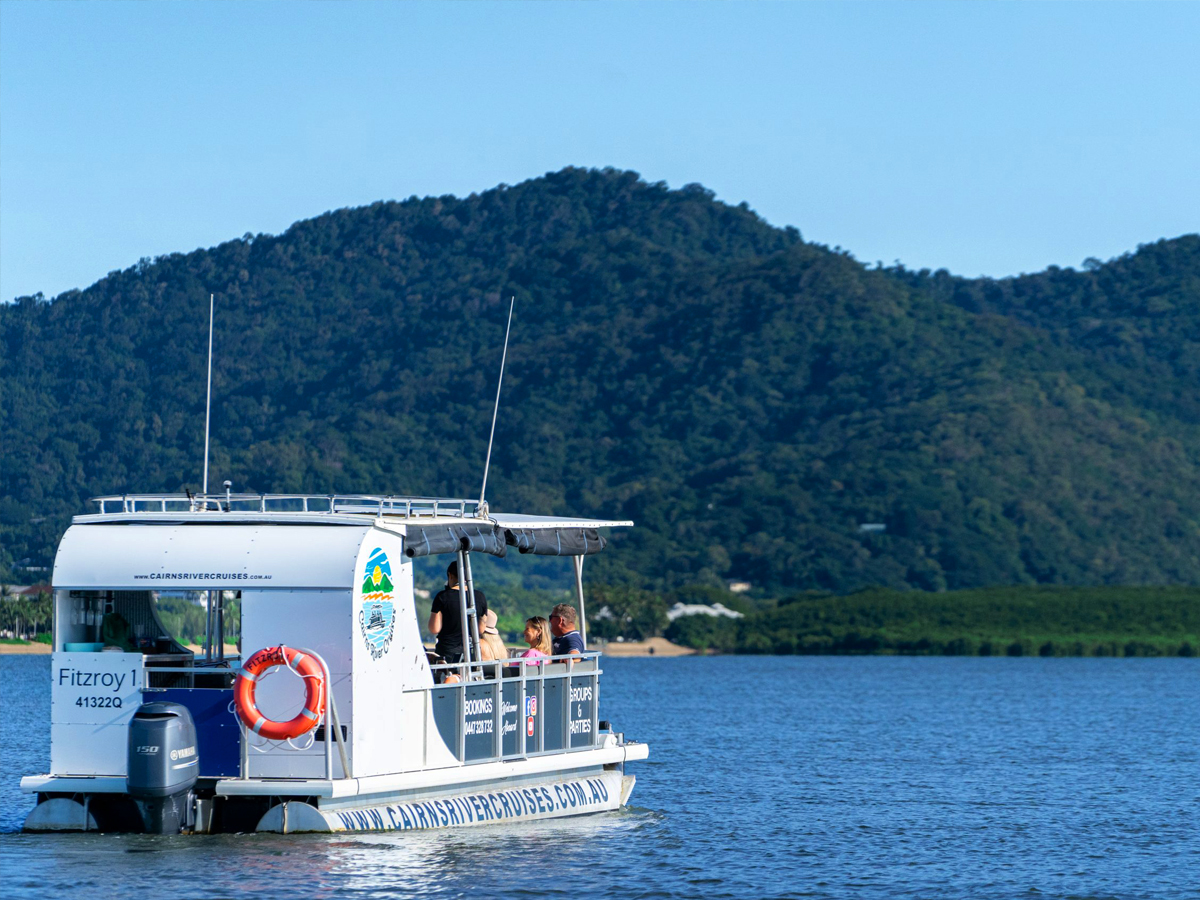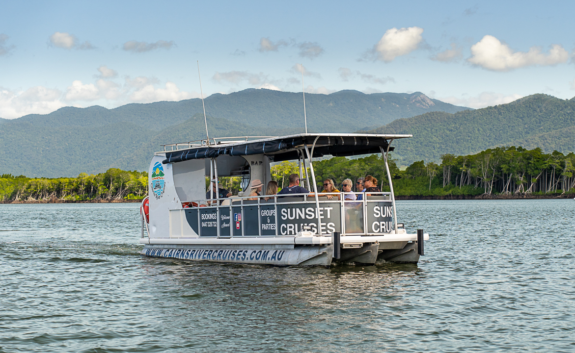 - Join us on a serene 75 minute calm water cruise along Cairns’ Trinity Inlet, the oceanic gateway that serves as the city’s port. As we glide through pristine creeks, you’ll discover the hidden charm of Cairns’ backwaters and unique sights along the way. After the cruise, enjoy a delicious lunch at the award-winning Dundee’s on the Waterfront. Your adventure continues in the afternoon with our Cairns City Sights Tour, exploring the highlights of this vibrant city. guided calm-water cruise explores the stunning sights of the Trinity Inlet and waterfront of Cairns. The extensive and stunning Inlet is mountain-mangrove-lined and is a sanctuary for many types of wildlife. The tour meanders through pristine creeks (the home of saltwater crocodiles) and takes in some of the quirky sites of the backwaters of Cairns. The Cairns River Cruises vessel is spacious and carries a maximum of 14 guests – so the tour is bespoke and personal, and everyone has access to the fantastic views of Cairns.