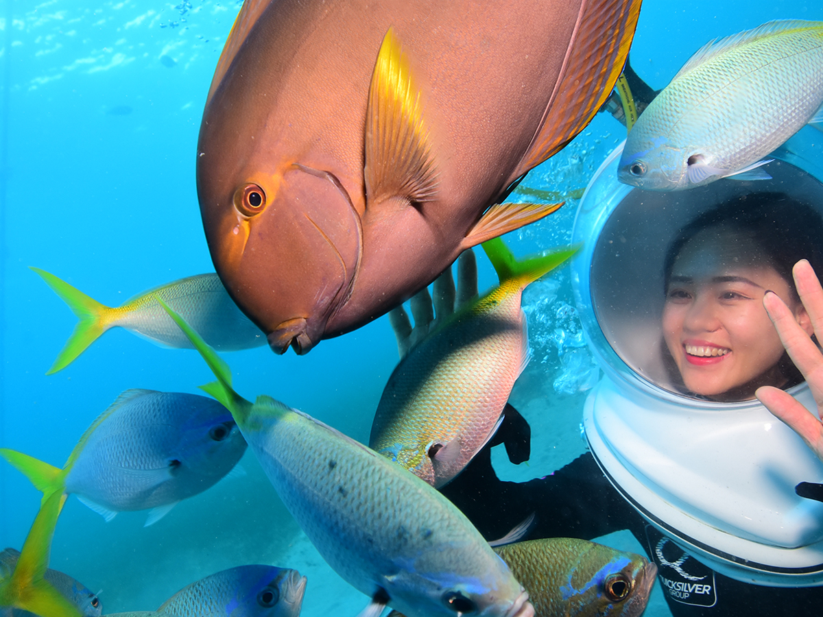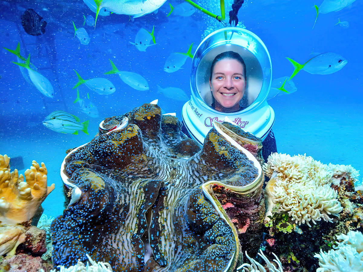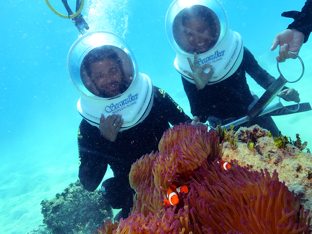 Underwater helmet diving experience on the Great Barrier Reef. Immerse yourself in the marine wonderland of the Great Barrier Reef and discover the underwater world from a different perspective. It’s a fun and engaging and easy to do. There is no equipment to operate, and non-swimmers are welcome; Seawalker is accessible to almost everyone and you don’t even have to get your hair wet!