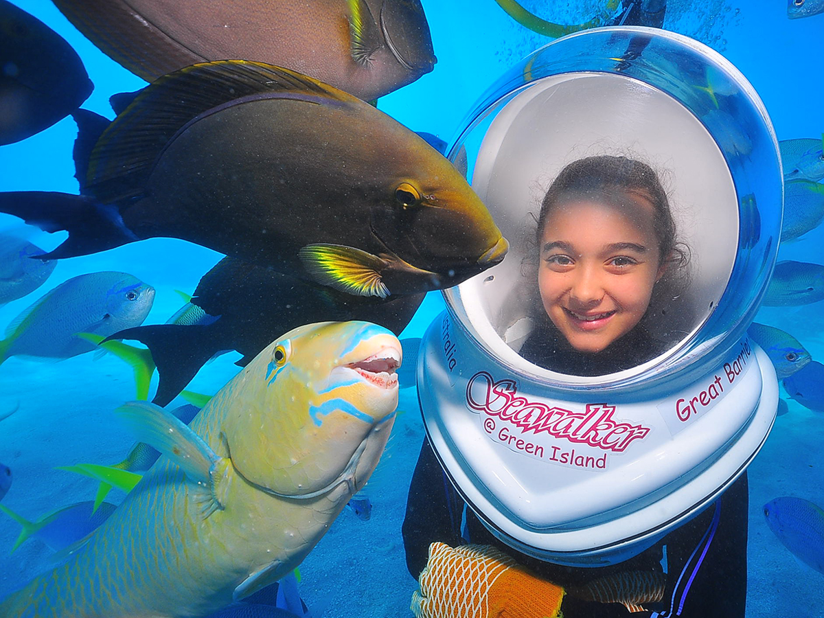 Seawalker Green Island offers an amazing underwater helmet diving experience on the Great Barrier Reef. Expert Guides will show you the wonders of the reef as you walk on the seafloor surrounded by colourful tropical fish and corals at beautiful Green Island, a 6000-year-old coral cay. There is no equipment to operate, and non-swimmers are welcome; Seawalker is accessible to almost everyone, and you don’t even have to get your hair wet!