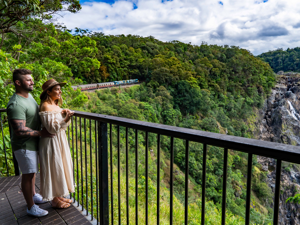 Return to Cairns on the historic and picturesque train journey on the Kuranda Scenic Railway. One of the most iconic sights along the journey, the train stops at a special lookout to offer passengers breathtaking views of this majestic Barron Falls.