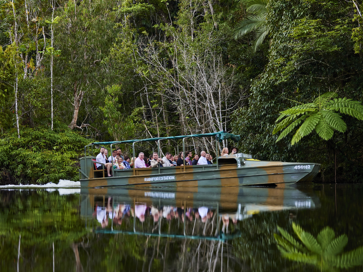 Begin your eco-friendly journey on our electric coach to Kuranda. Visit Rainforestation Nature Park for unique wildlife encounters, Pamagirri Aboriginal experience and an authentic World War 2 Army Duck rainforest tour. Explore Kuranda in your own time to wander through the shops and markets before returning on the breathtaking Skyrail Rainforest Cableway. Includes return hotel transfers.